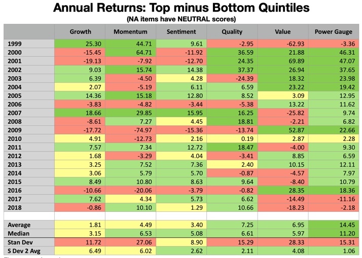 But look at how Growth fared in 2018. It fell, having parted company from Sentiment and Momentum. There’s a warning there. Sentiment and Momentum depend on opinions, expectations, and stories regarding the future. Growth consists of historic growth rates. Rather than encompassing expectations, Growth addresses that which has actually been delivered.
