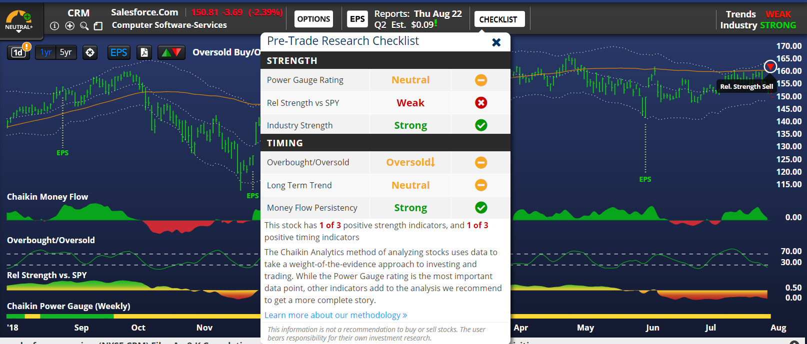 On Chaikin Analytics, my first inclination in a situation like this is to input CRM into the site’s “Discovery Tool” which identifies key characteristics of the stock in question and suggests others with common elements you might consider as alternatives.
