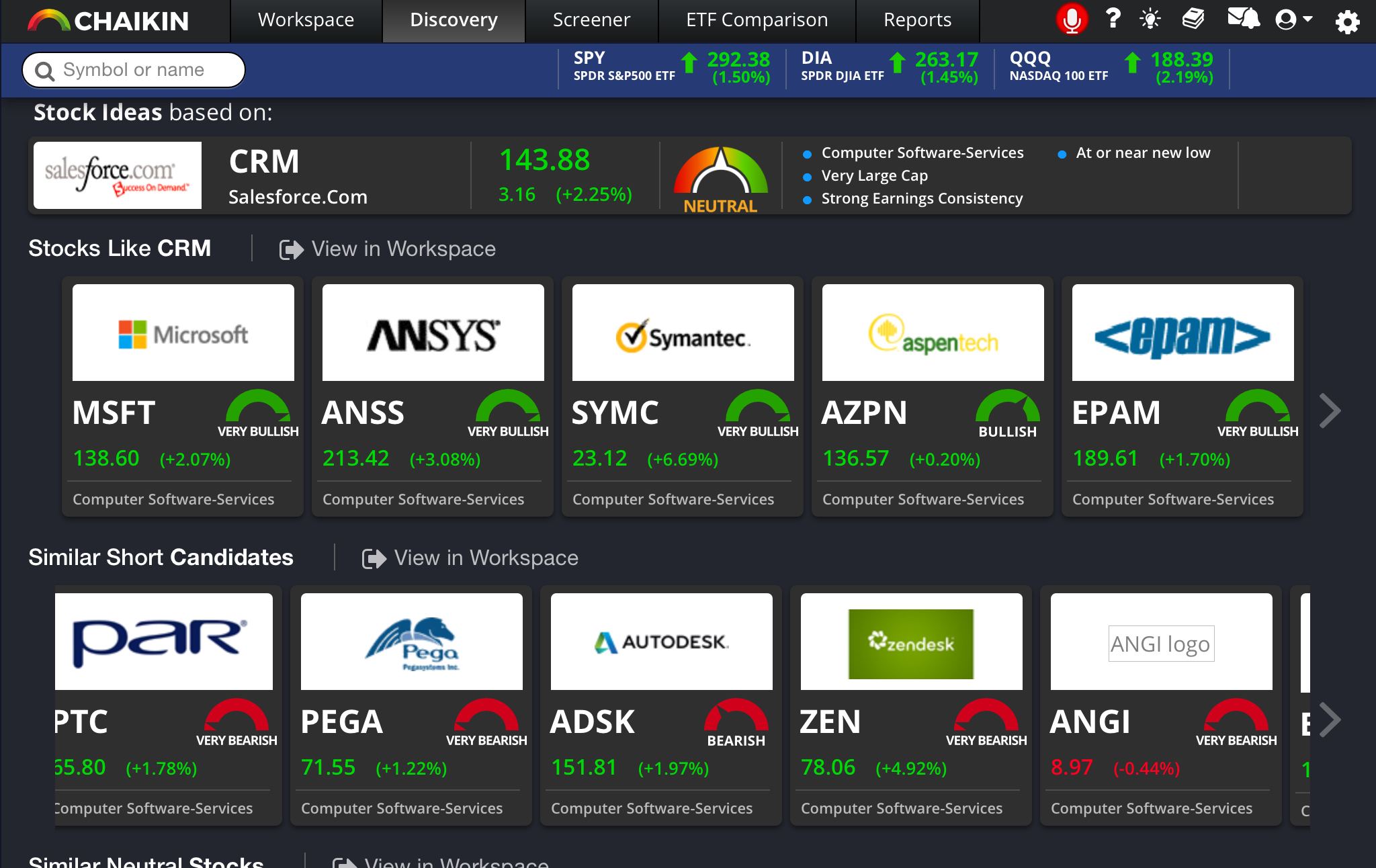 Also, the illustration here shows two categories of alternative ideas. Scrolling down further would have shown me three additional categories; Similar Neutral Stocks, Similar Technicals, and ETFs Holding CRM. I can go through each category easily by clicking the “View in Workspace” link. Figure 3 shows what I’d be looking at if I clicked to “Stocks like CRM” in the workspace.