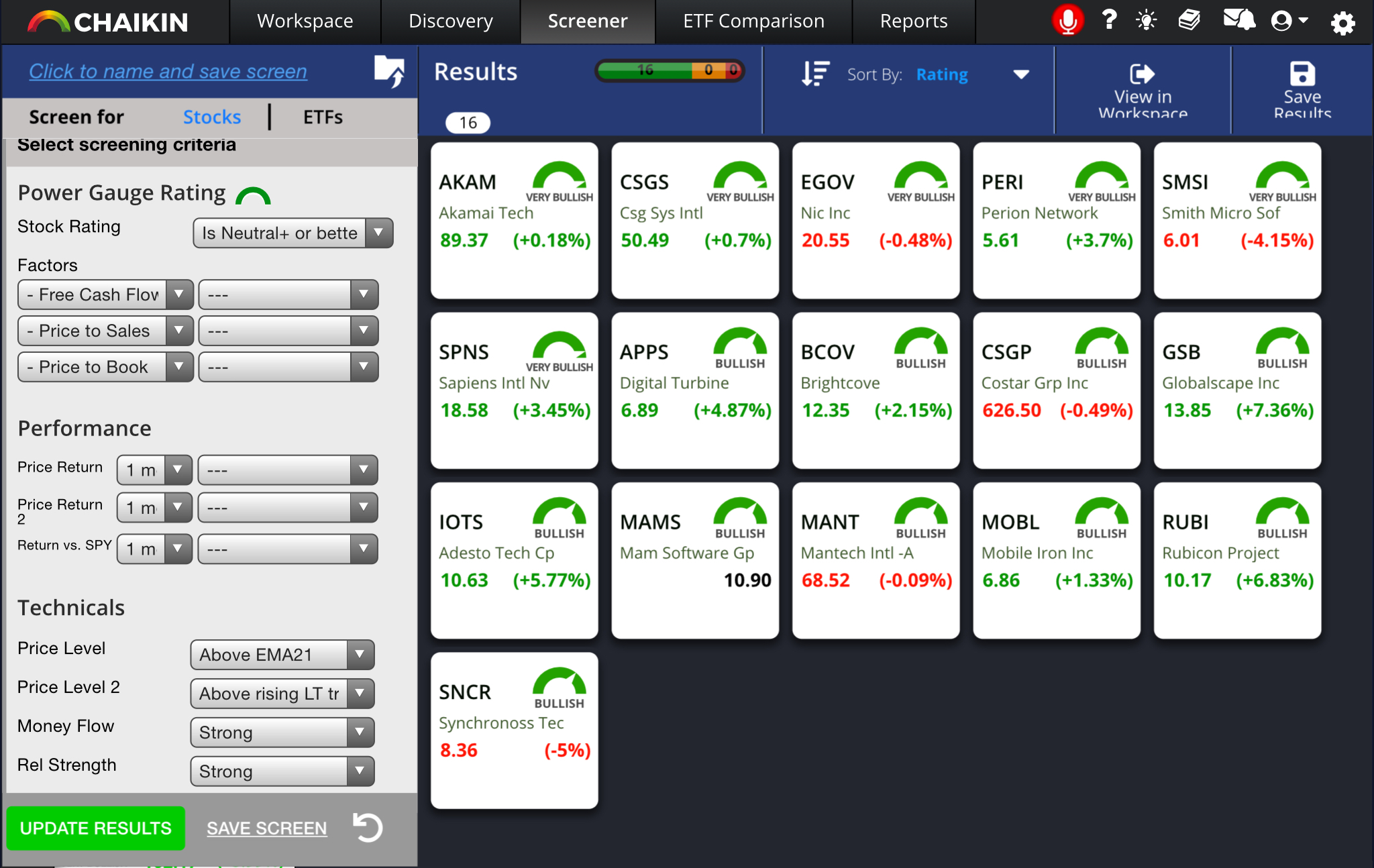 Using the Chaikin Analytics screener, I might start by inputting rules based on the bullish aspects of Salesforce.