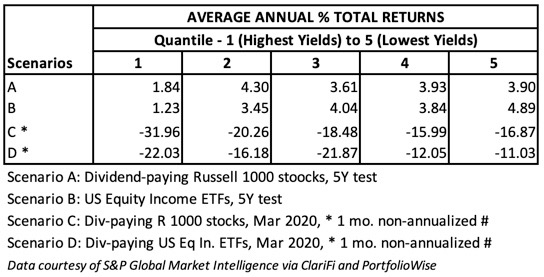 The sucker-yield phenomenon, the inverse relationship between current yield and realized future return, is genuine. Fama-French documented it back in 1988, and I’ve seen it myself many times; Table 1 shows results of some examples. (Notice that even in the March 2020 crash, high yield did not serve as a protective shield against outsized losses.