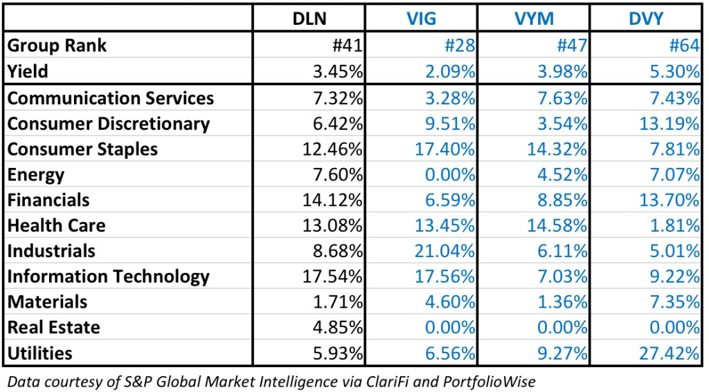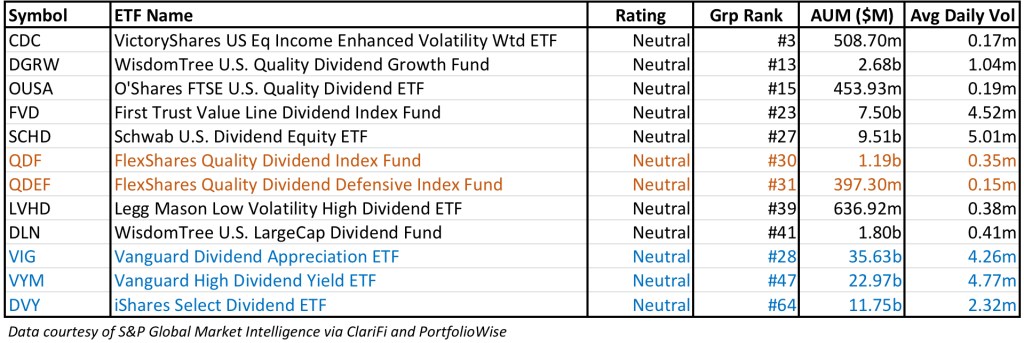 The blue rows signify exceptionally large ETFs. There is a strong probability that accounts positioned in Equity Income either own at least one of these, or at least watches them closely for benchmarking purposes.
