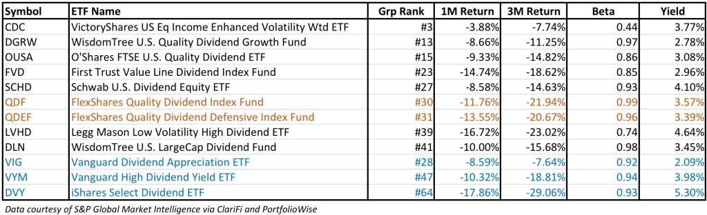 Even those who aren’t adding money to or pulling away from equities should be on the lookout for opportunities to switch from lesser to more promising ETFs within the same strategy. I created an extremely simple screen on PortfolioWise to identify Dividend ETFs with yields of at least 2% that rated no less than neutral. I sorted the result set from best-to-worst based on Group Rank and then visually scanned based on yield and relative performance in the last traumatic month (thus taking cues from the market’s oft-demonstrated proficiency in recognizing the worst candidates) and identified, as worth further review, the ETFs identified in Tables 2a and 2b. (See below for explanations of differently-colored rows.) I particularly confined the list to ETFs that pursue analytic approaches to stock selection and thus eliminated ETFs based on popular dividend aristocrat type themes (except for DVY, which is included because of its popularity and benchmark-like stature), these being a group that warrants a separate post.