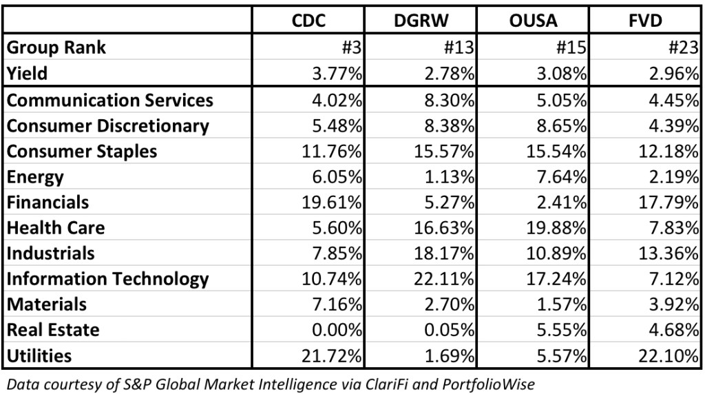 The yield on the First Trust Value Line Dividend Index ETF (FVD) seems low relative to its seemingly lackluster sector exposure. But stock selection here is keyed to stocks Value Line rates well for Safety (a rank that combines the company’s Financial Strength and Price Stability ratings). We measure risk differently than does Value Line, but our approach points to similar conclusions regarding portfolio holdings. It does, therefore, appear that this ETF holds is picking better quality stocks within lesser sectors. The safety message being delivered by the modest yield looks legitimate to us.
