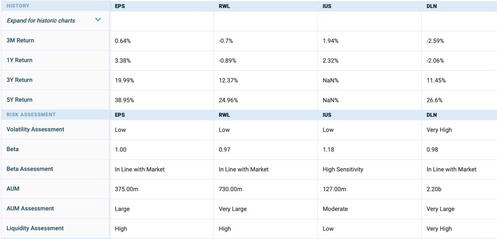 IUS hasn’t been around long enough to definitively characterize its track record relative to this smart-beta peer group (I may not care about smart beta relative to SPY, but it’s is interesting to see how these ETFs compare to one another). But given my lengthy career doing stock-specific fundamental analysis, I’m most comfortable with its balanced multi-prong measure of shareholder wealth. So that’s my top pick today. I also have a conservative-income oriented streak and like DLN too.