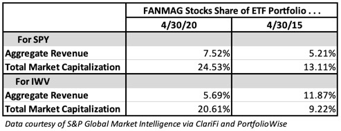 I did, however, acknowledge last week, that the best argument in favor of the concentration about which I complained would be that the FANMAG and FANMAG-like stocks deserve the weightings they now have because they have become the business word of today. That argument can be quickly defeated by Table 1, which compares the percentage of portfolio assets invested in FANMAG stocks with the percentage of revenue (relative to all other portfolio-owned companies) they account for in SPY and in the broader iShares Russell 3000 ETF (IWV) (ETF Home):