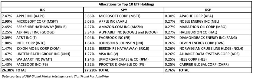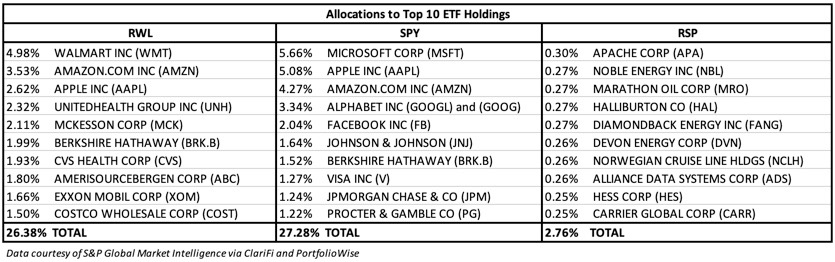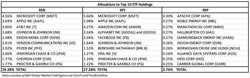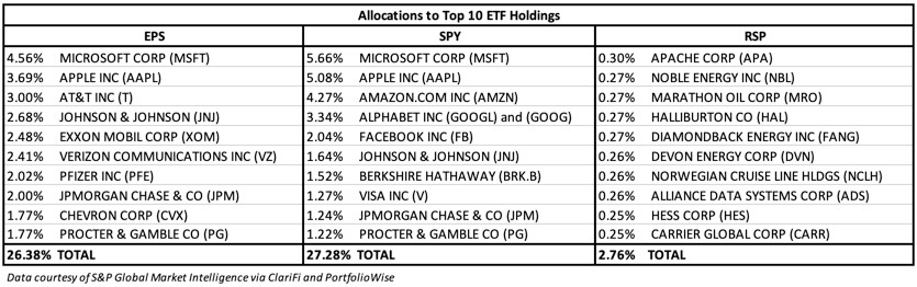As you might have guessed from the ticker, this is an earnings-weighted ETF. Below is a top-10 table that shows the ten largest holdings for EPS and for comparative purposes, SPY and RSP (comparisons with the latter two will be shown for the other ETFs to be presented below.)