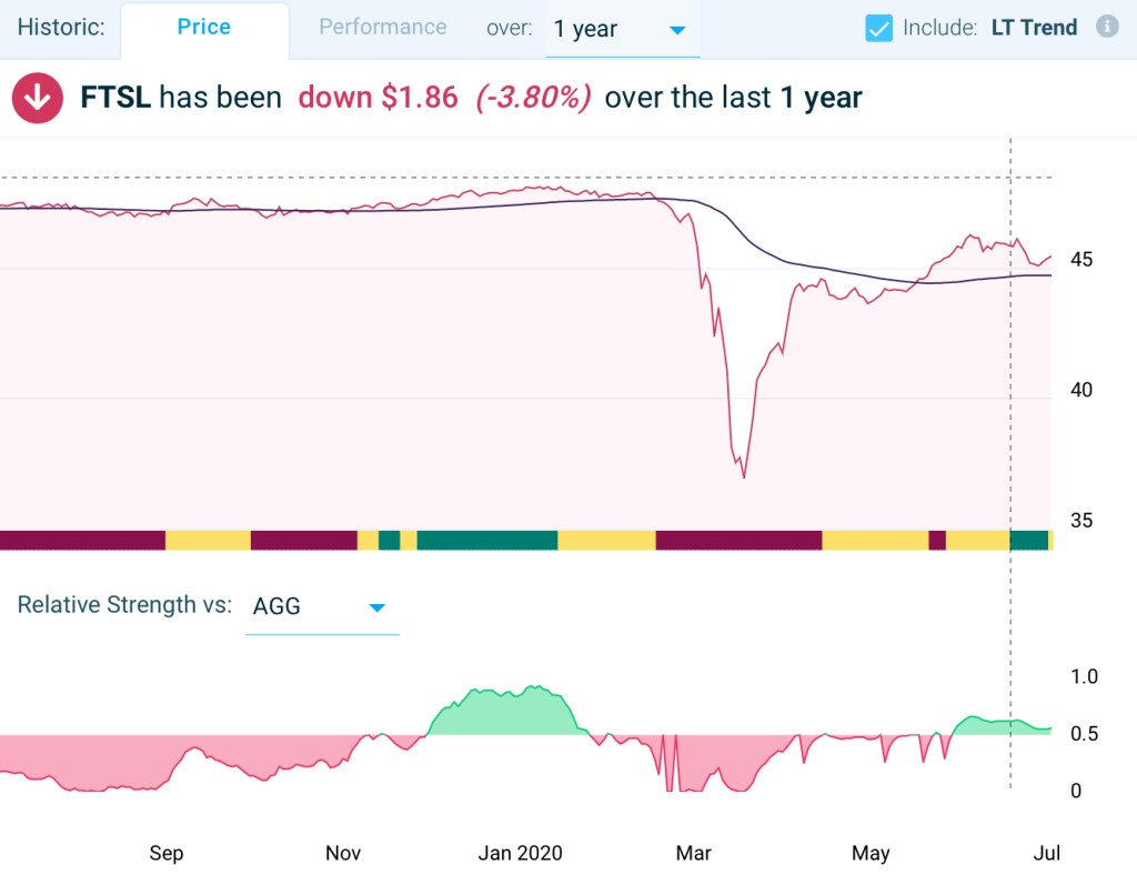 I suspect FTSL’s Beta has something to do with its higher expense ratio. I’m not necessarily a Vanguard groupie: I’m OK with higher fees for more customized products, and credit-analysis ETFs should cost more than generic buy-them-all offerings. My focus is on return to me in the stock market, and that is tied to ETF net asset values which are computed after fees and expenses have been subtracted. FTSL must achieve a higher portfolio-return hurdle in order to deliver comparable marketplace returns. That, I suspect, has something to do the higher relative-to-the-market Beta we’re seeing.