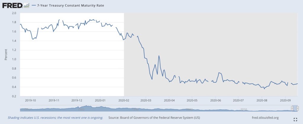 Board of Governors of the Federal Reserve System (US), 7-Year Treasury Constant Maturity Rate [DGS7], retrieved from FRED, Federal Reserve Bank of St. Louis; https://fred.stlouisfed.org/series/DGS7, FRED chart updated Sep. 18, 2020